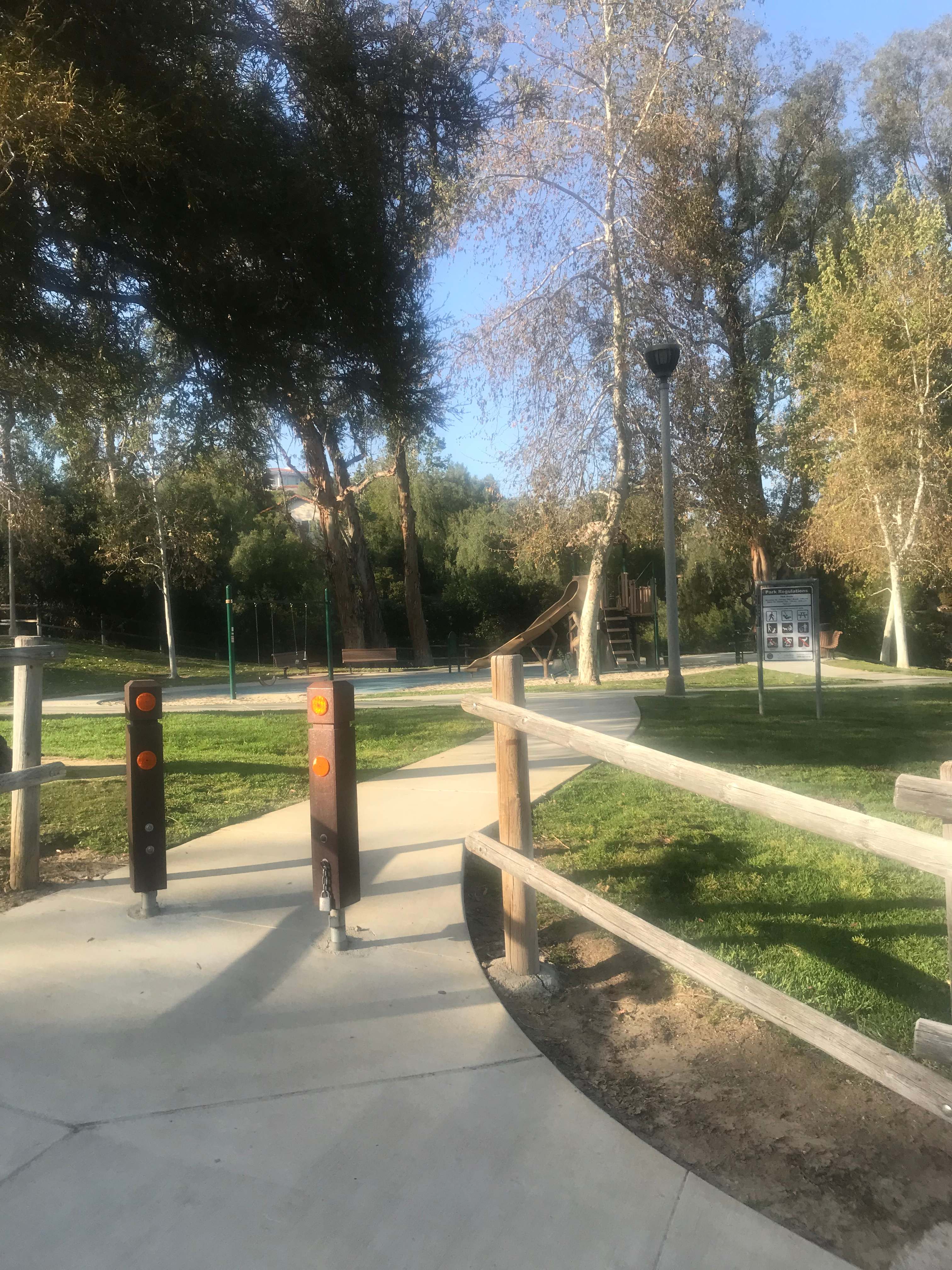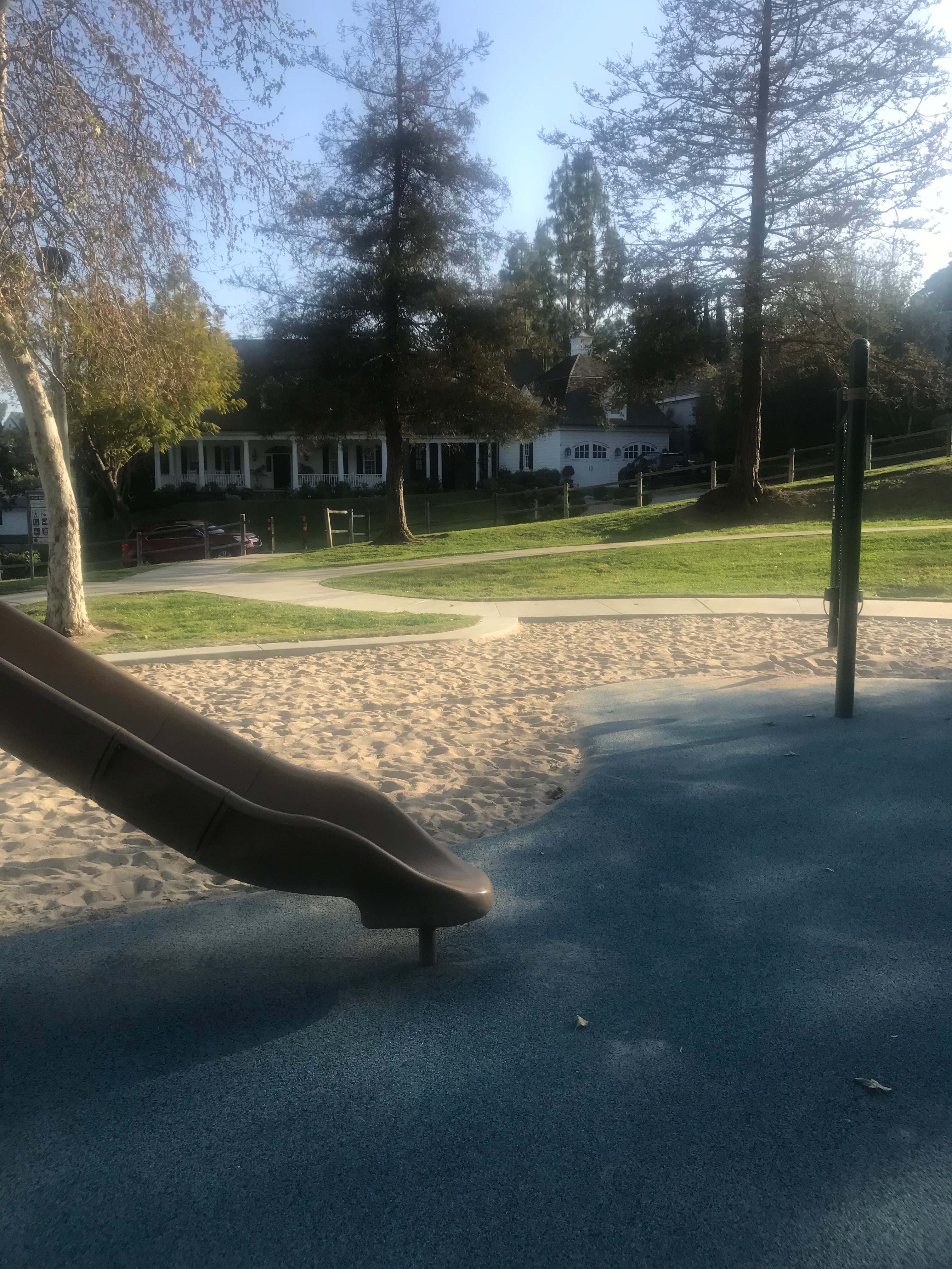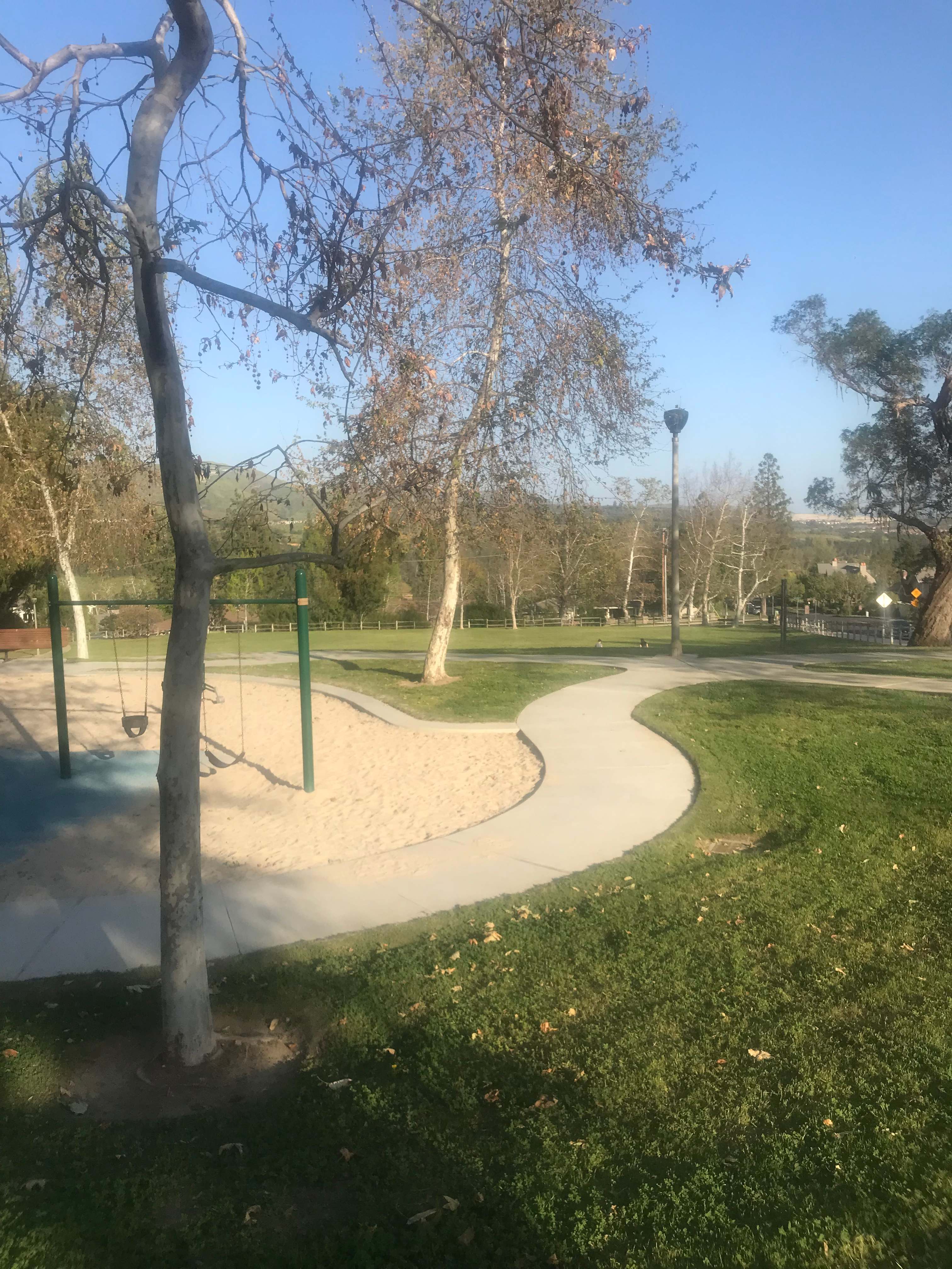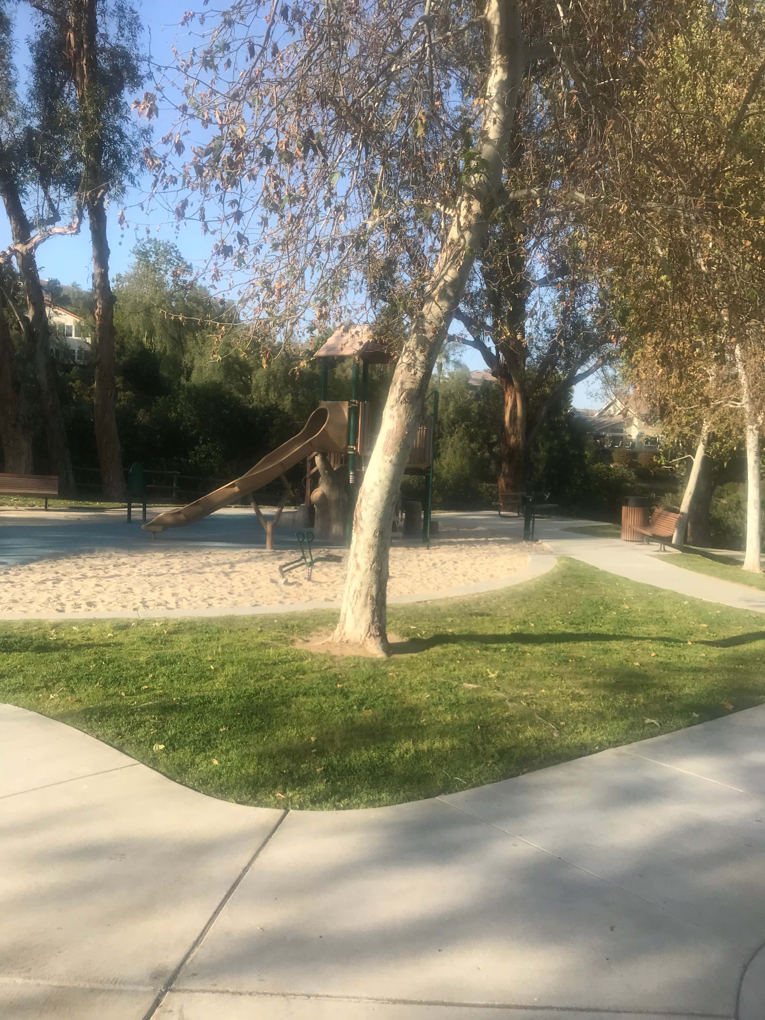 Bent Tree Park is a quiet park tucked away in an unincorporated neighborhood of North Tustin. There are no shelters or bathrooms, but there is a small playground, sand volleyball court, and a large open field. Parties could potentially be held here on a first come first serve basis without reservations, but no onsite bathrooms pose an issue if not living in walking distance. The north and west perimeters of the park are surrounded by sycamore trees. Smaller sycamore trees are also scattered throughout the playground area and lawn. Santiago Hills can be seen in the distance.