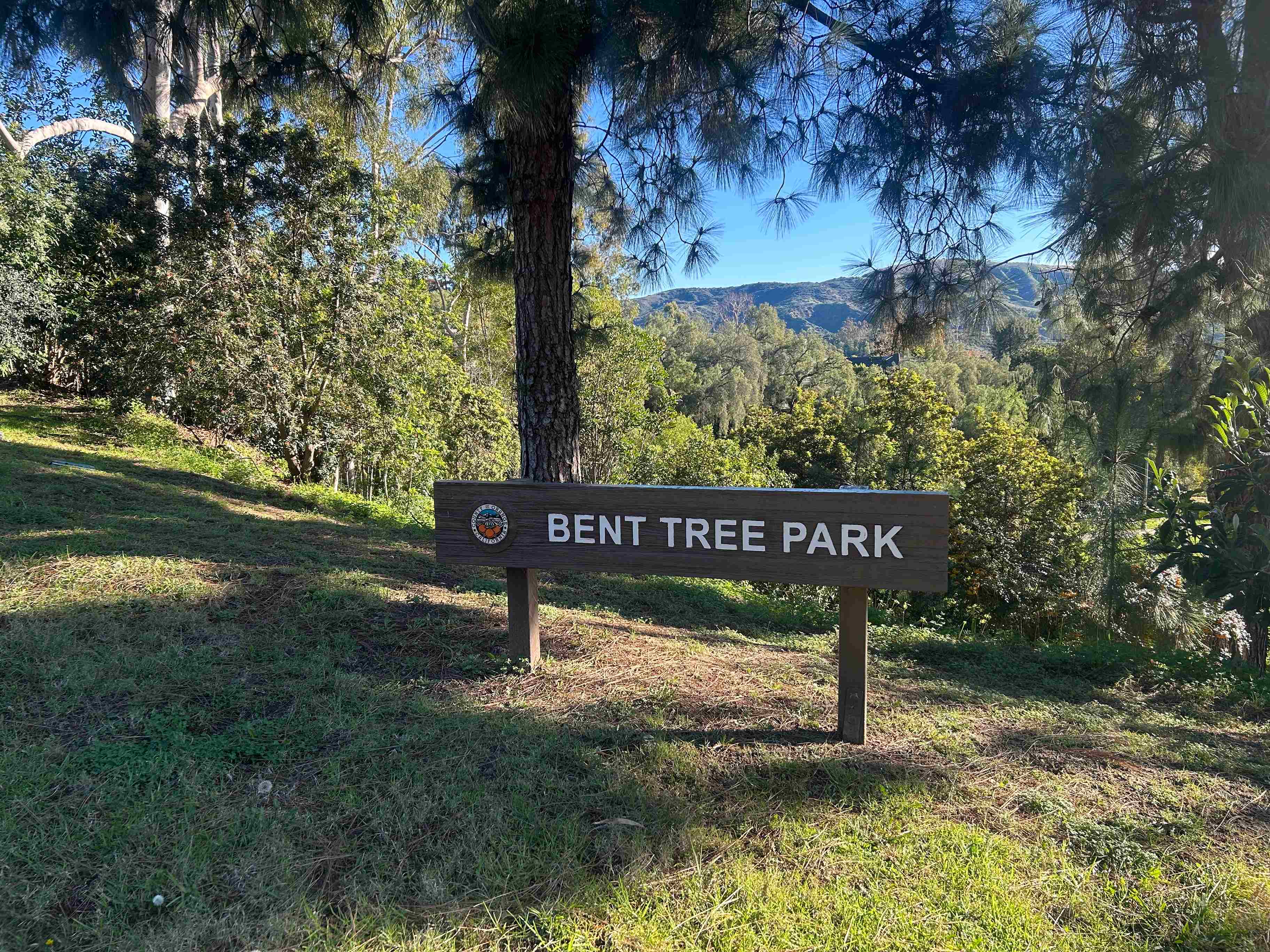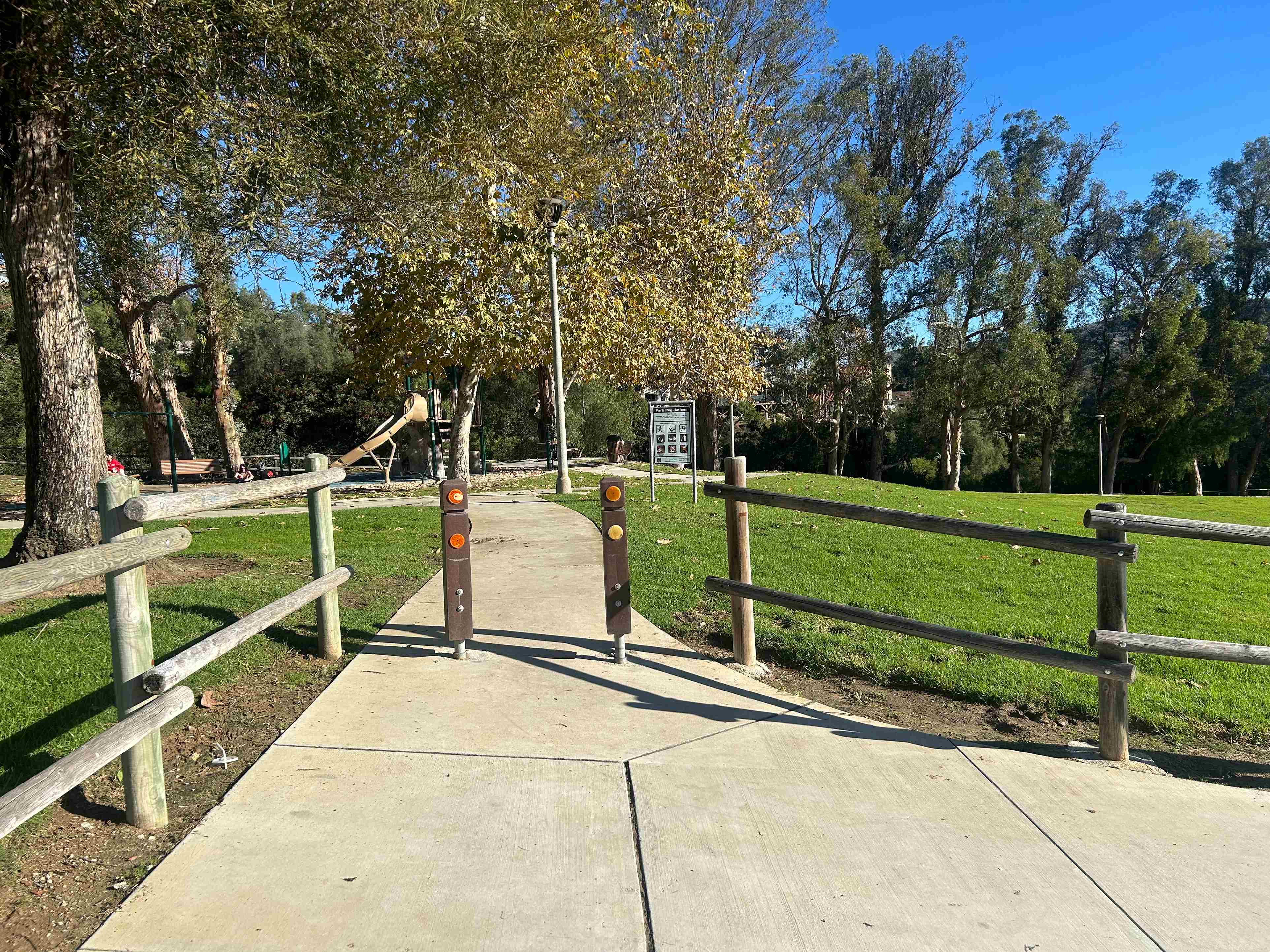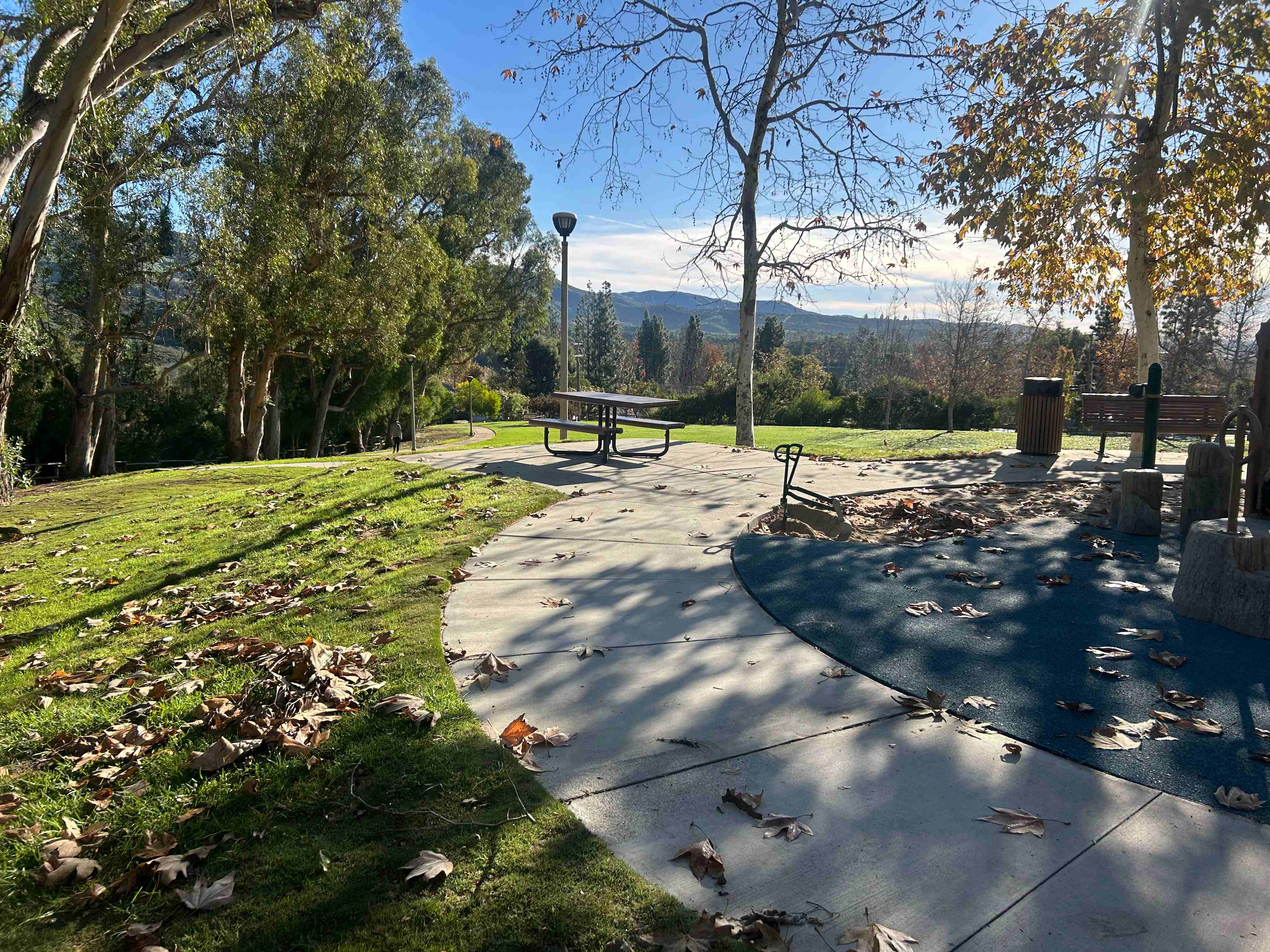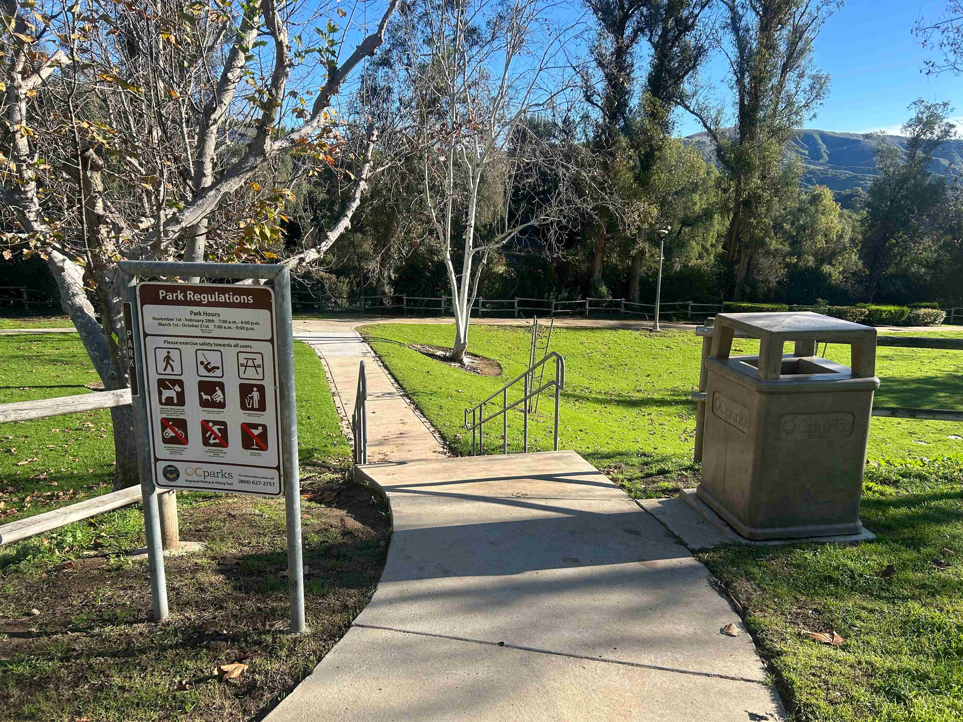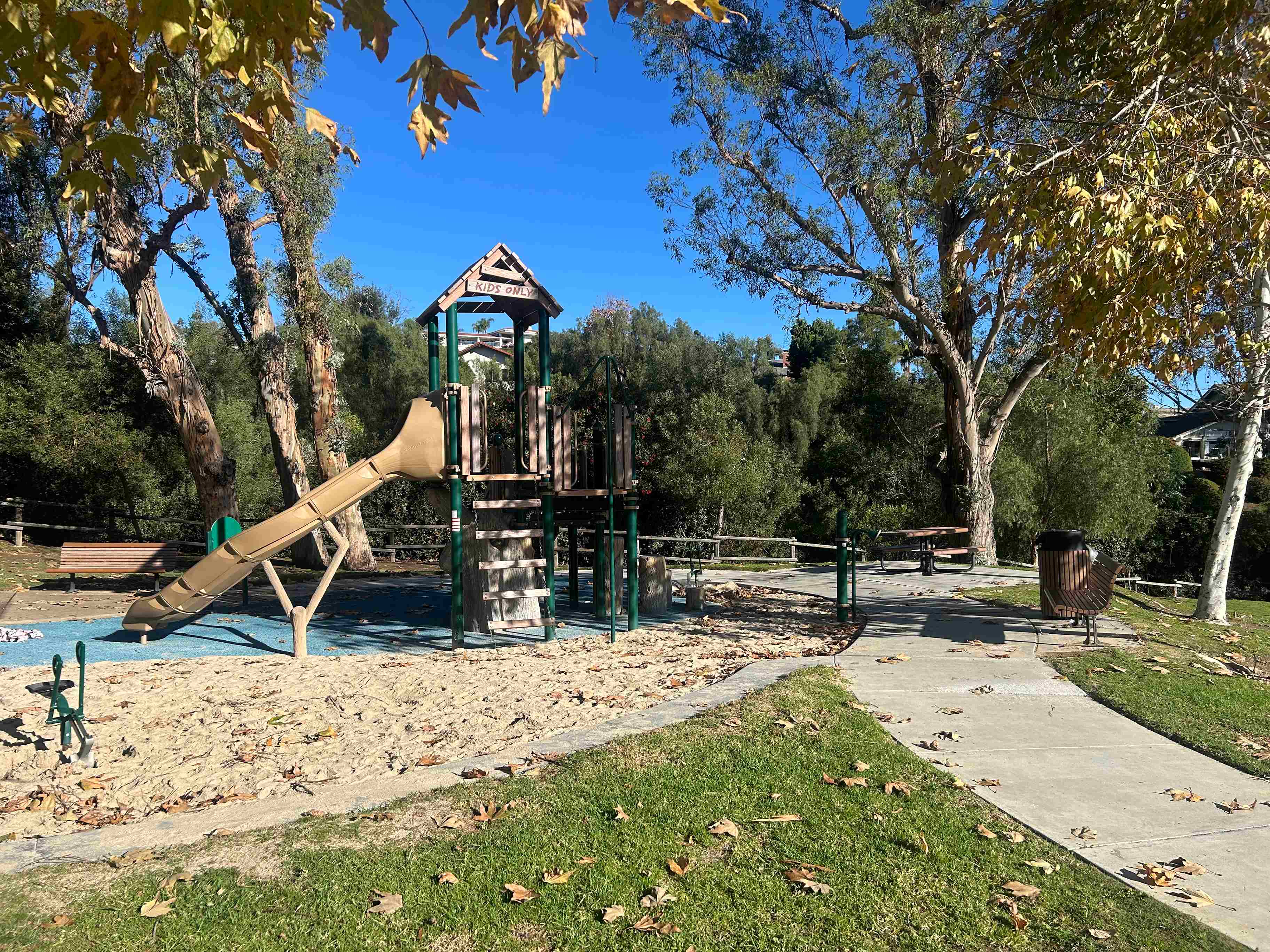 Bent Tree Park is a quiet park tucked away in an unincorporated neighborhood of North Tustin. There are no shelters or bathrooms, but there’s a small playground, sand volleyball court, and a large open field. Parties could potentially be held here on a first come first serve basis without reservations. However, no onsite bathrooms pose an issue if not living in walking distance. A canyon filled with sycamore trees and various plants is behind the playground. It stretches from the east to the west end of the park. A multi-use path that’s partly paved and partly dirt circles the canyon. Smaller sycamore trees are also scattered throughout the playground area and field. Santiago Hills can be seen in the distance.