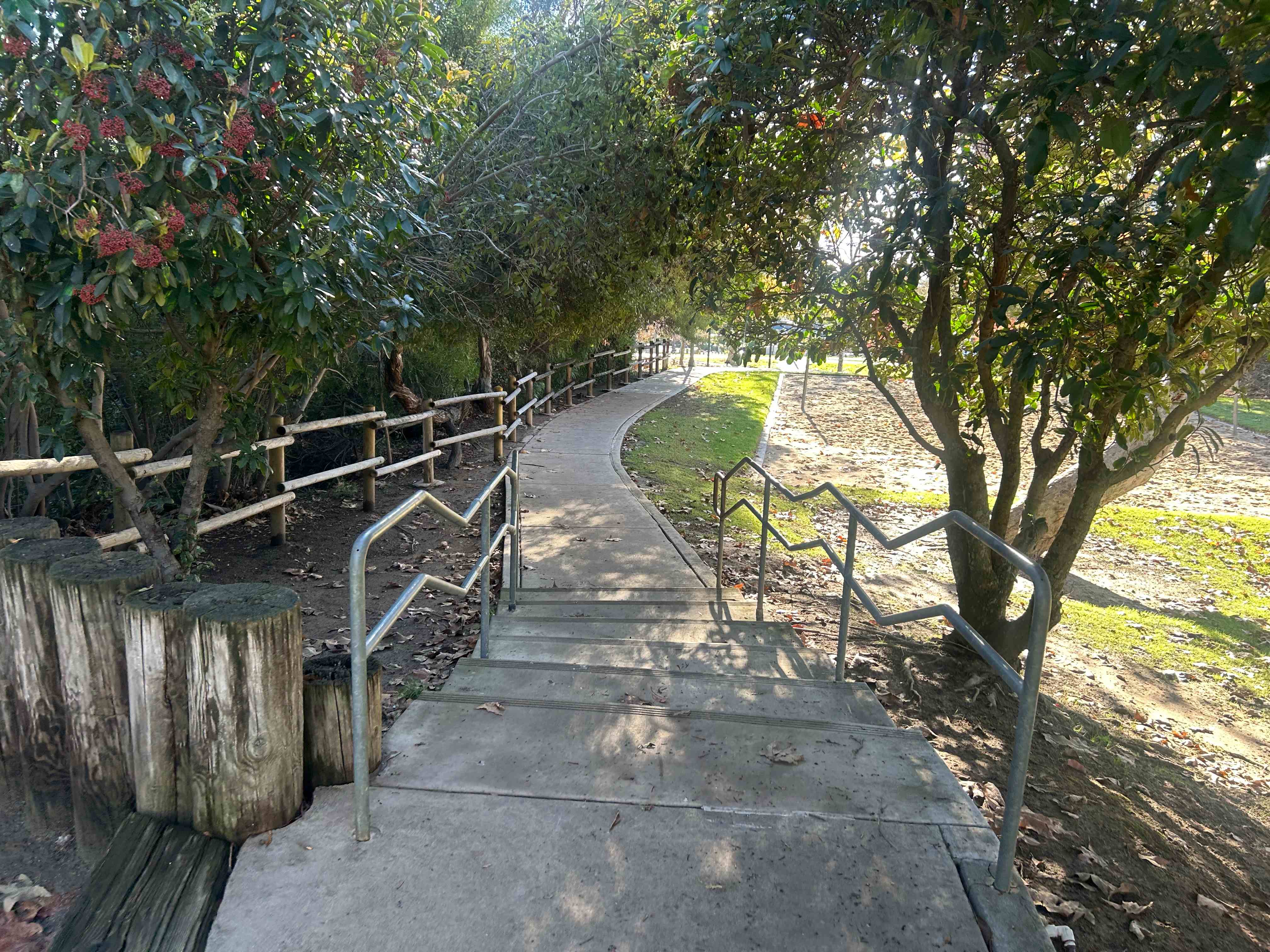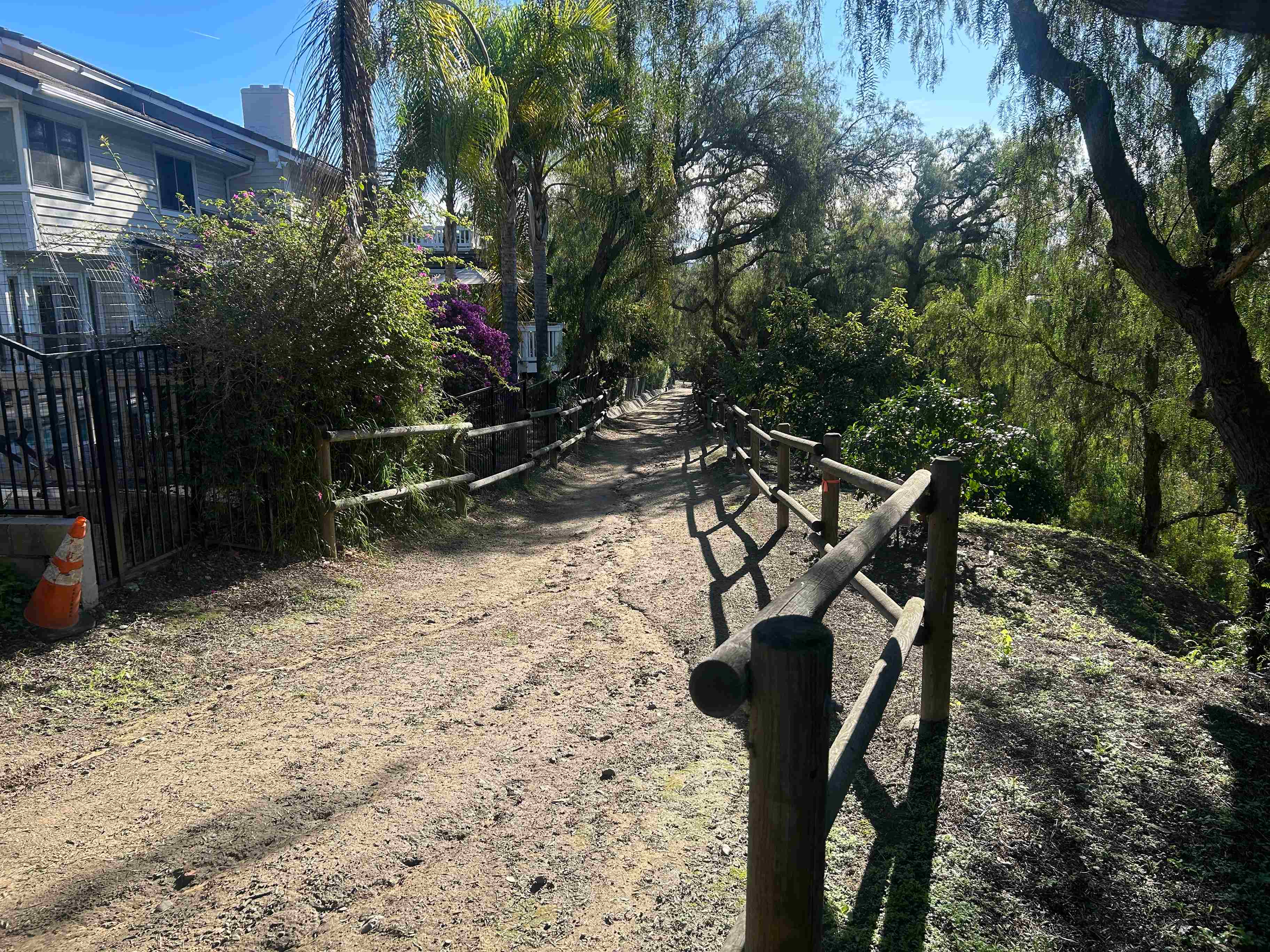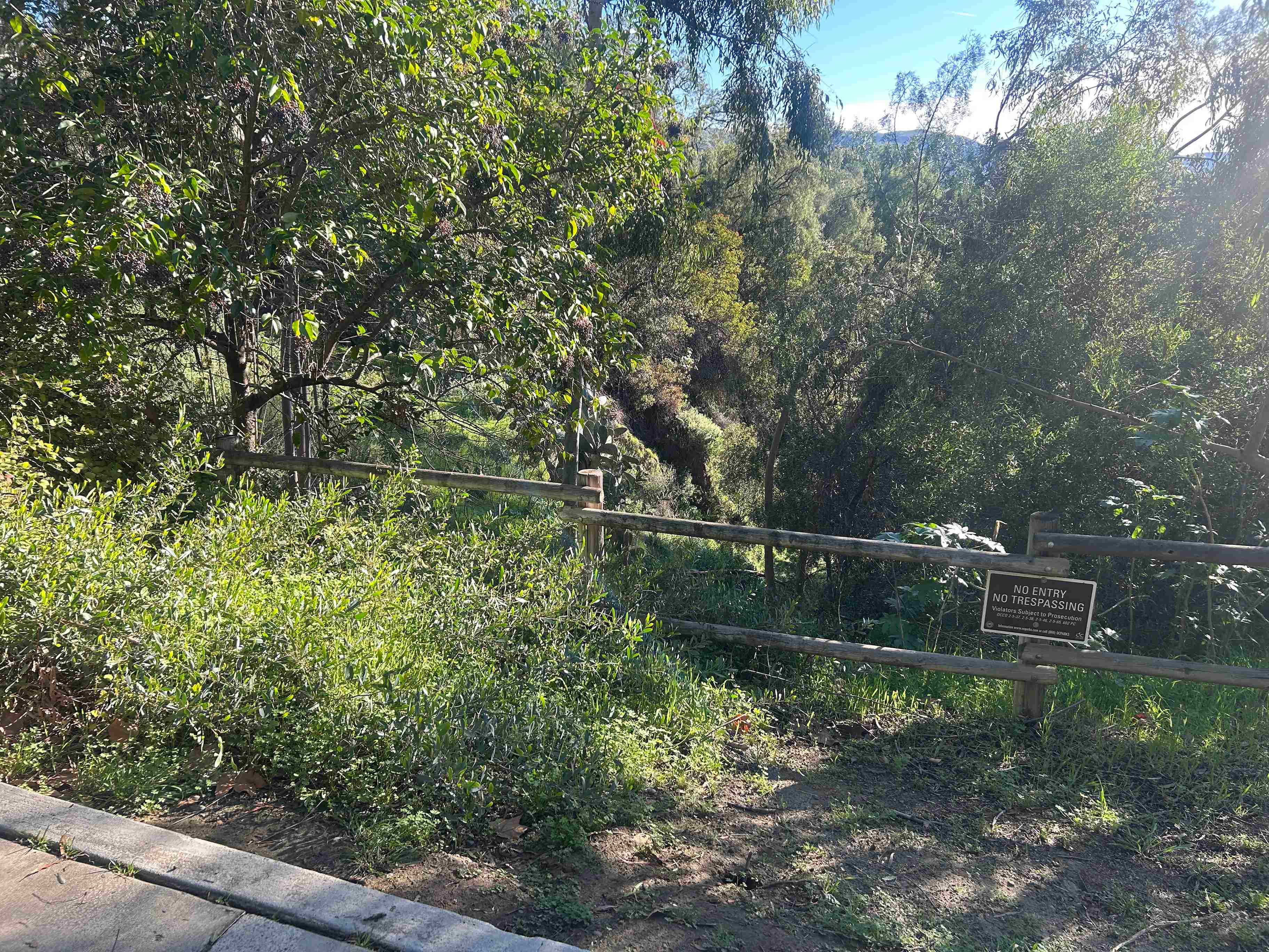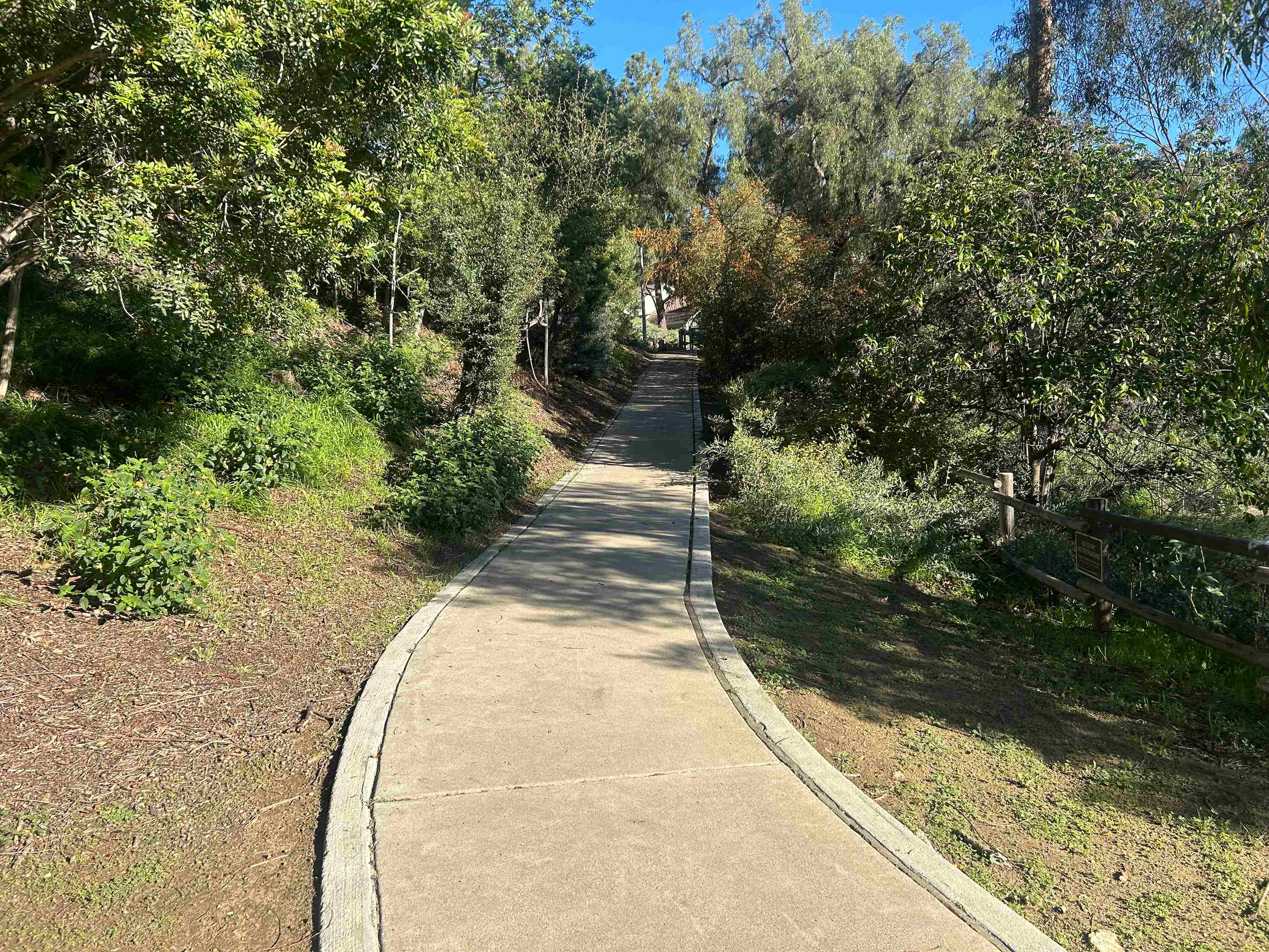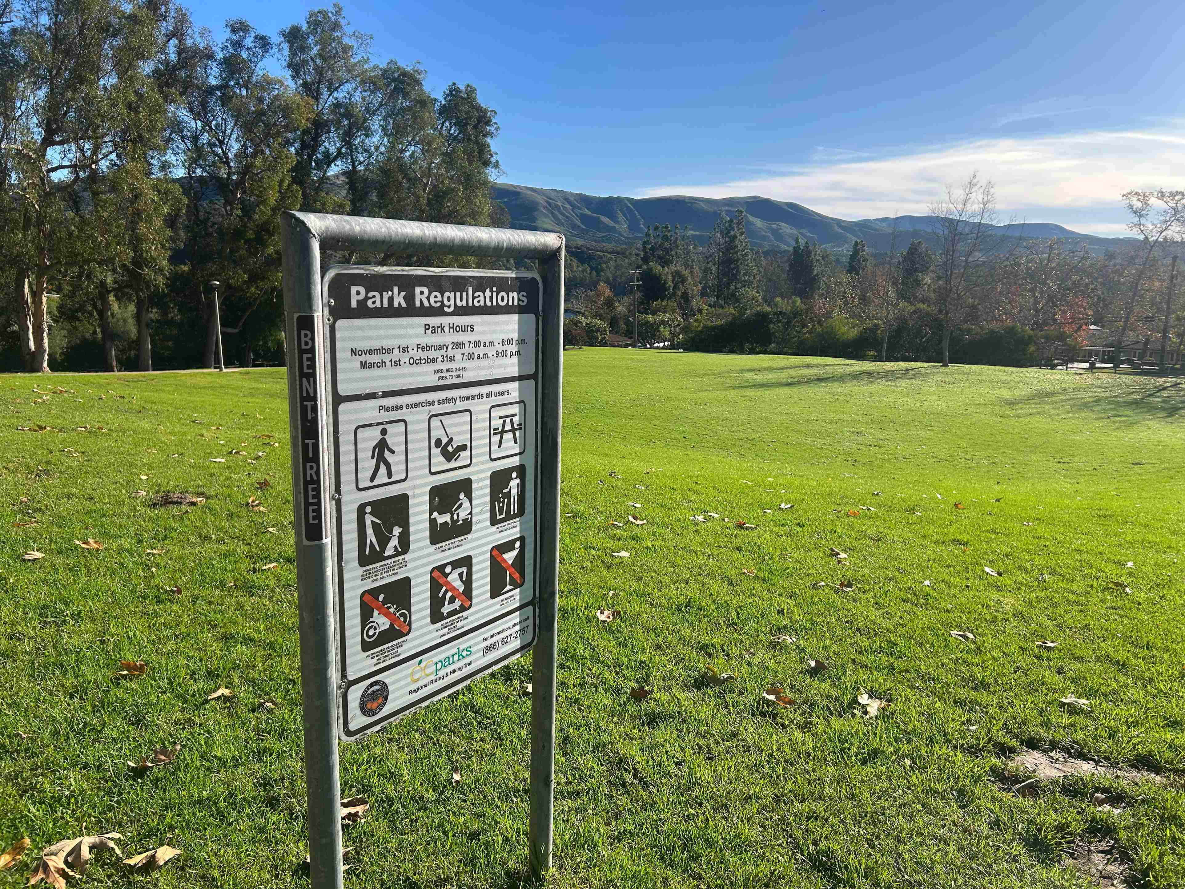Bent Tree Park is a quiet park tucked away in an unincorporated neighborhood of North Tustin. There are no shelters or bathrooms, but there’s a small playground, sand volleyball court, and a large open field. Parties could potentially be held here on a first come first serve basis without reservations. However, no onsite bathrooms pose an issue if not living in walking distance. A canyon filled with sycamore trees and various plants is behind the playground. It stretches from the east to the west end of the park. A multi-use path that’s partly paved and partly dirt circles the canyon. Smaller sycamore trees are also scattered throughout the playground area and field. Santiago Hills can be seen in the distance.