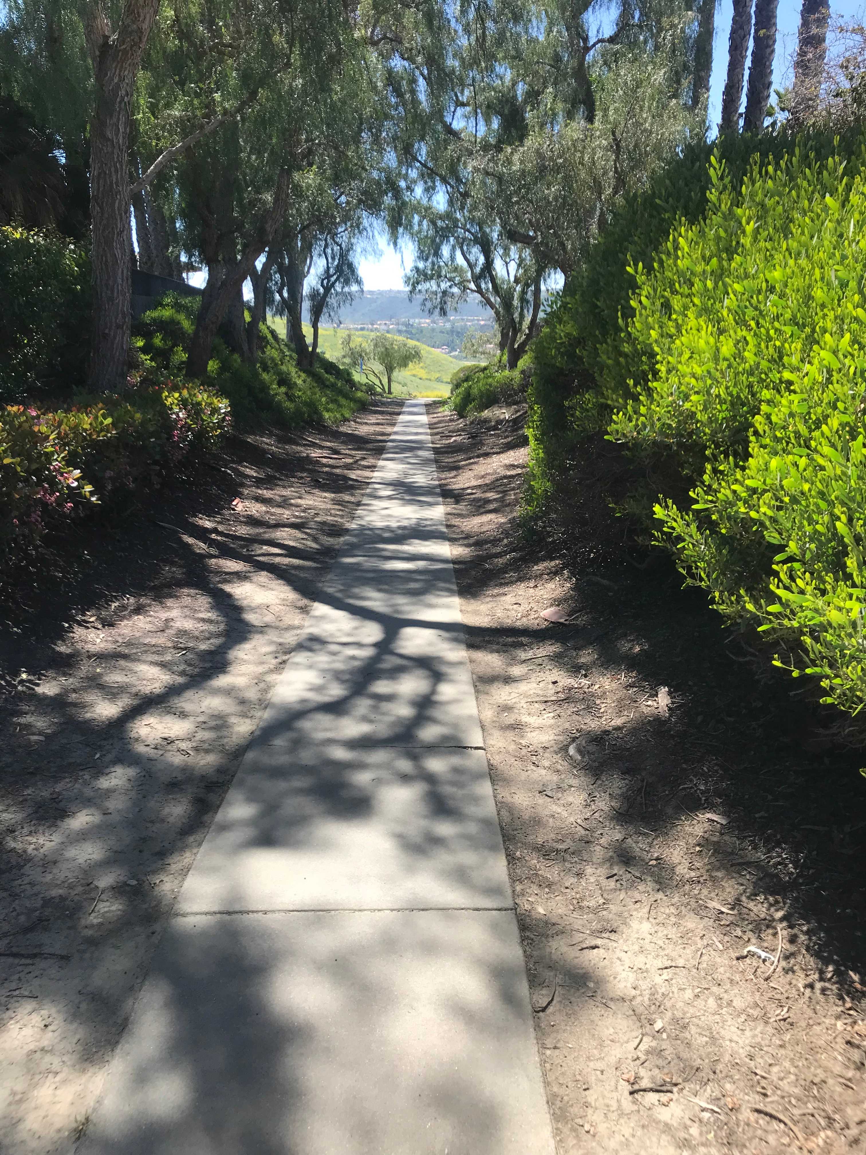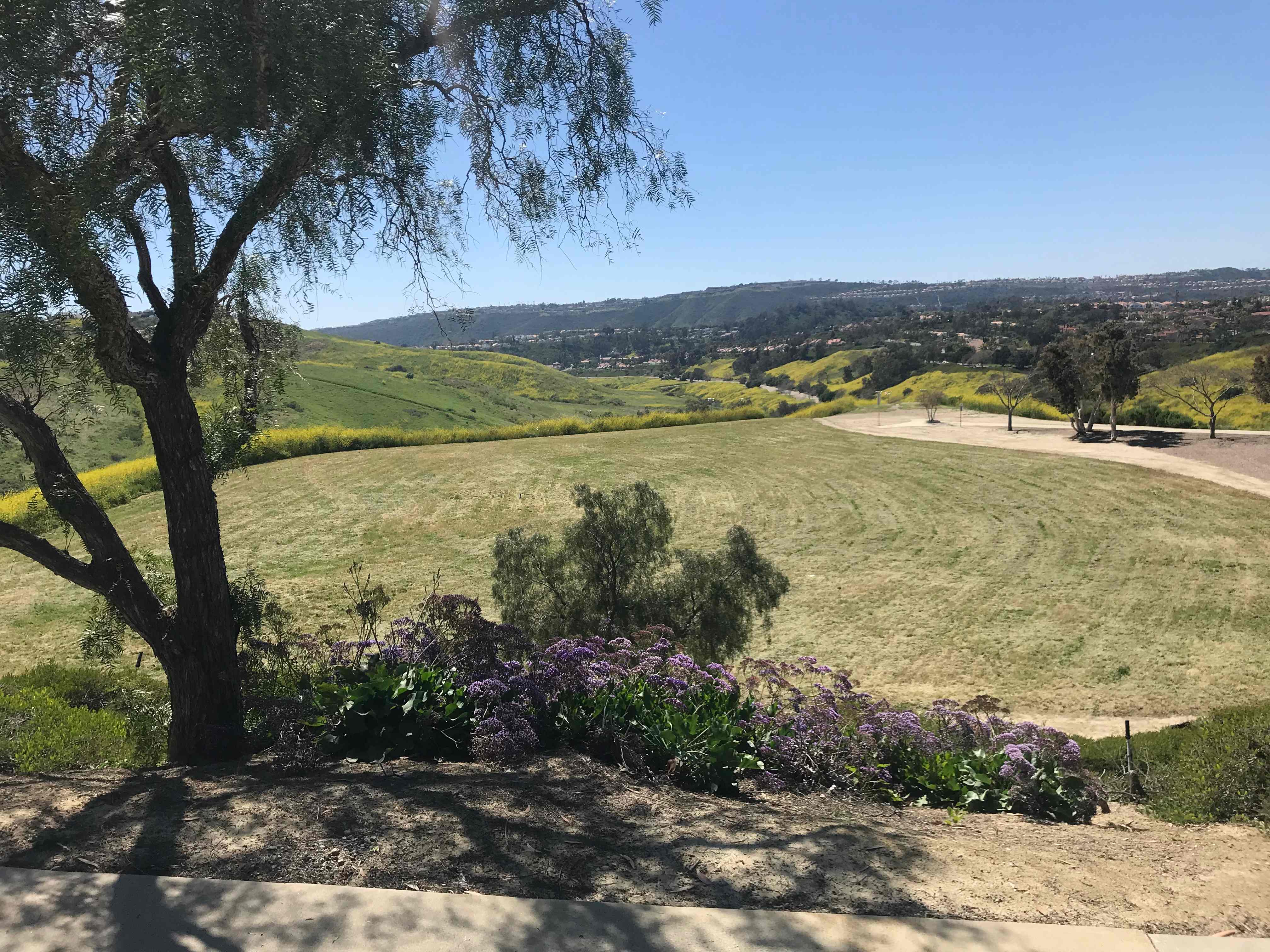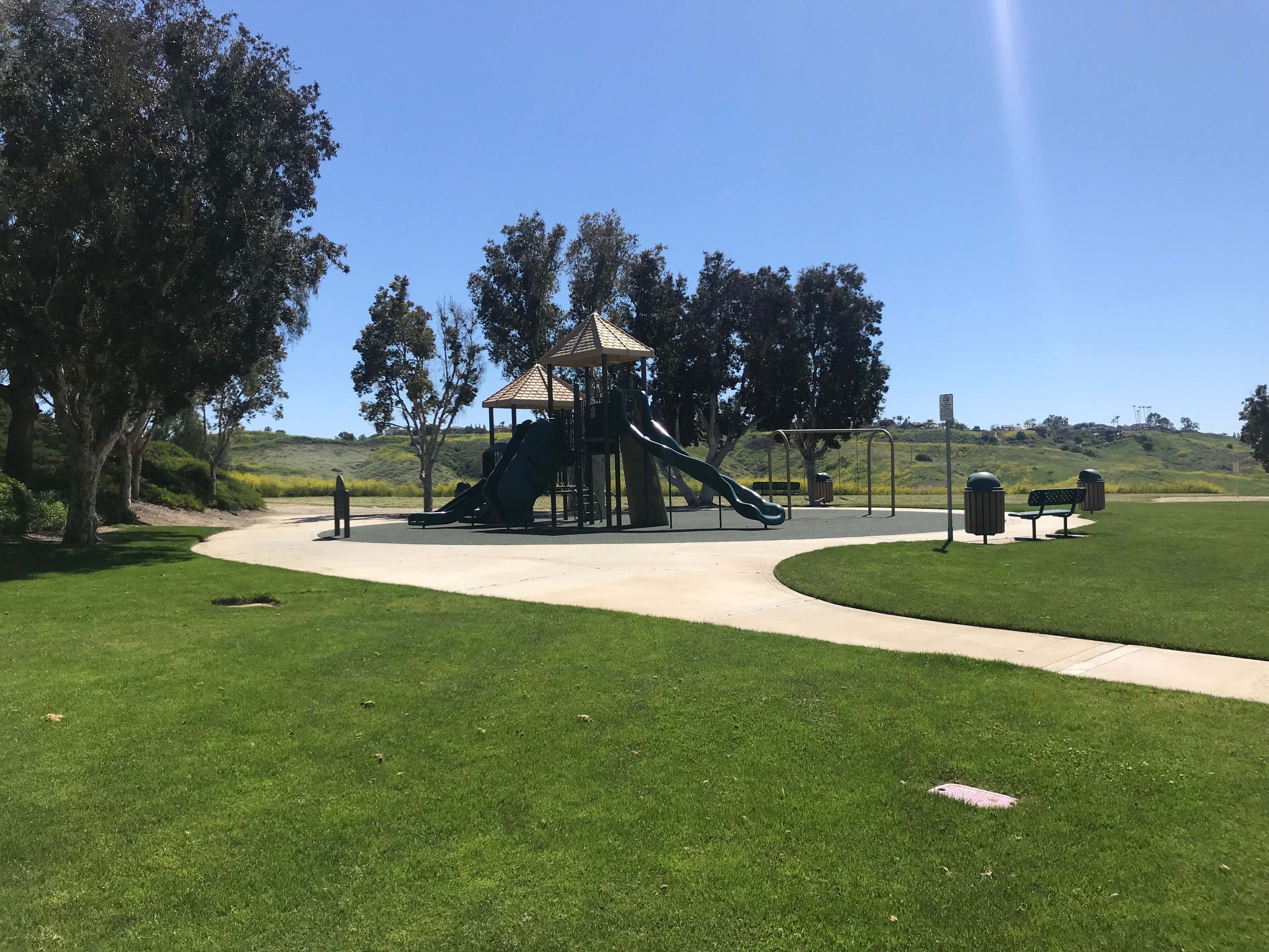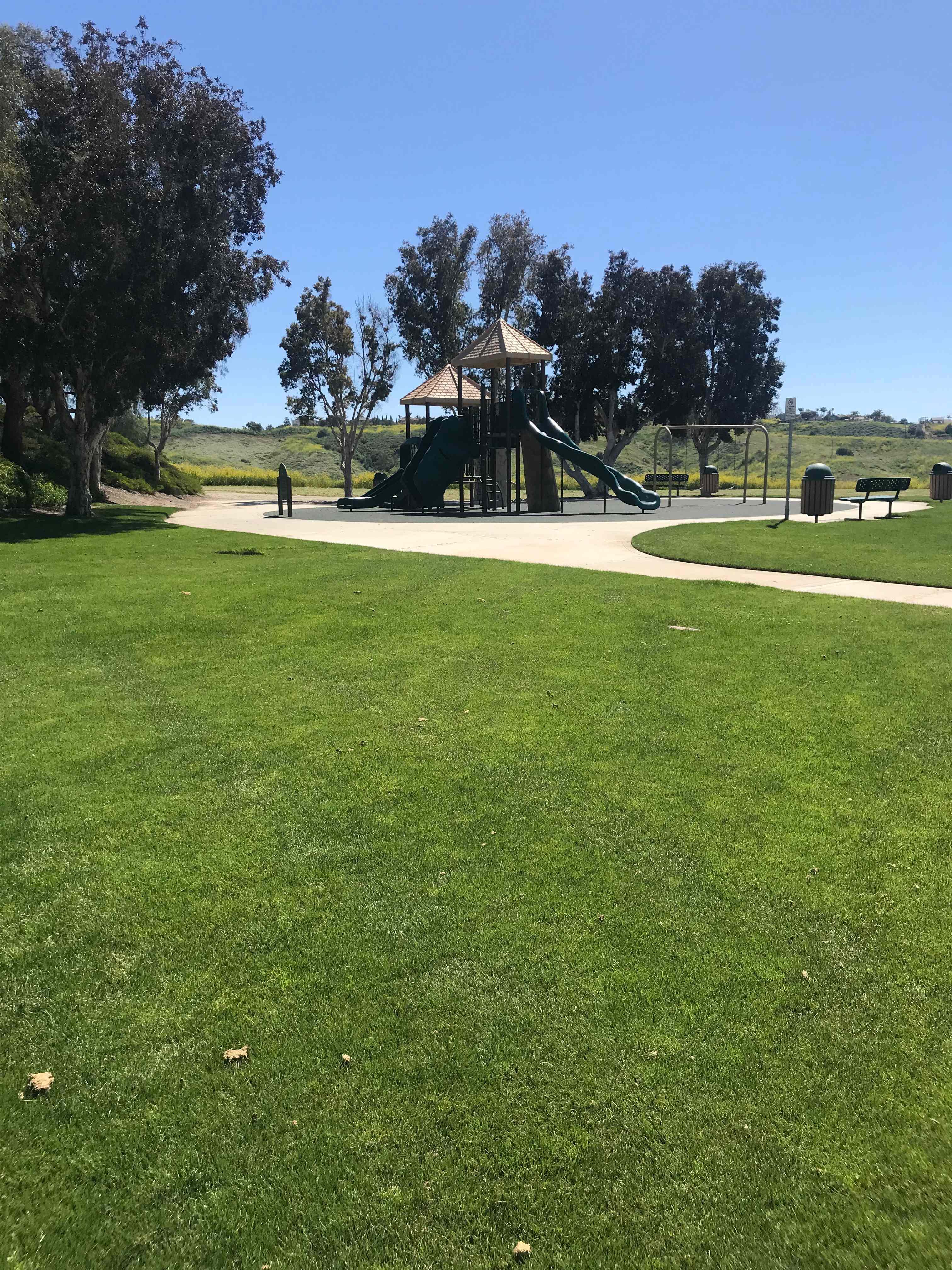 You have to park on the cul-de-sac and take the long sidewalk that goes behind the houses to get to this park. The park will be tucked behind the residential cul-de-sac. The park has a lawn, playground, and a bench. It’s perched on the top of a hill so it has sweeping views of the surrounding hillsides, Salt Creek, and Chapparosa Park below. No bathrooms are on the premises, though walking down the hill on a trail to the bathrooms at Chapparosa Park would take about 10 minutes.