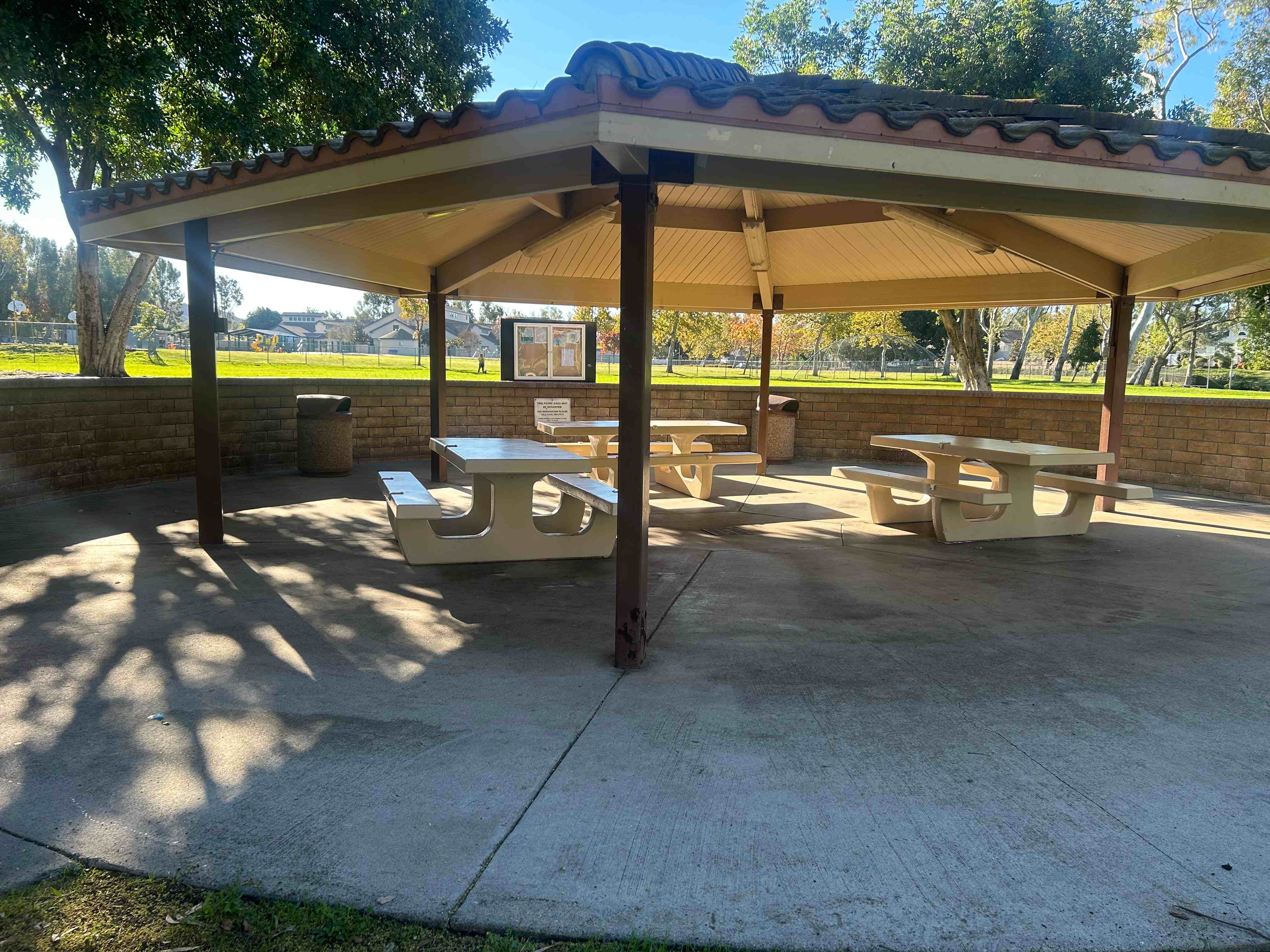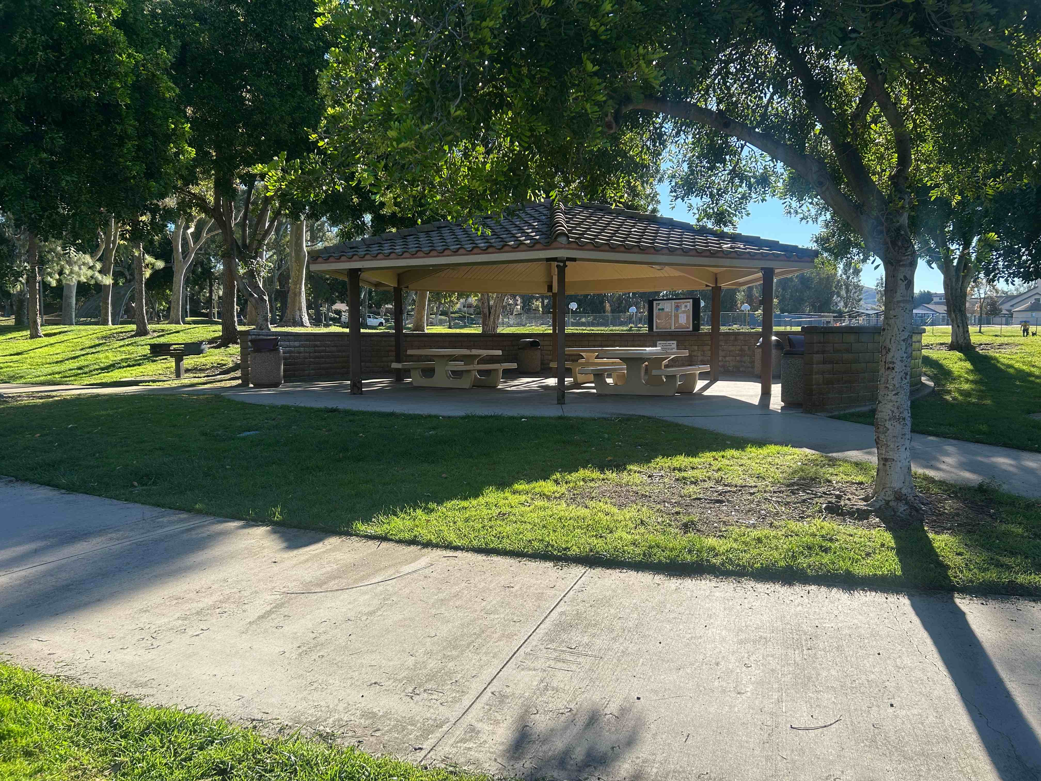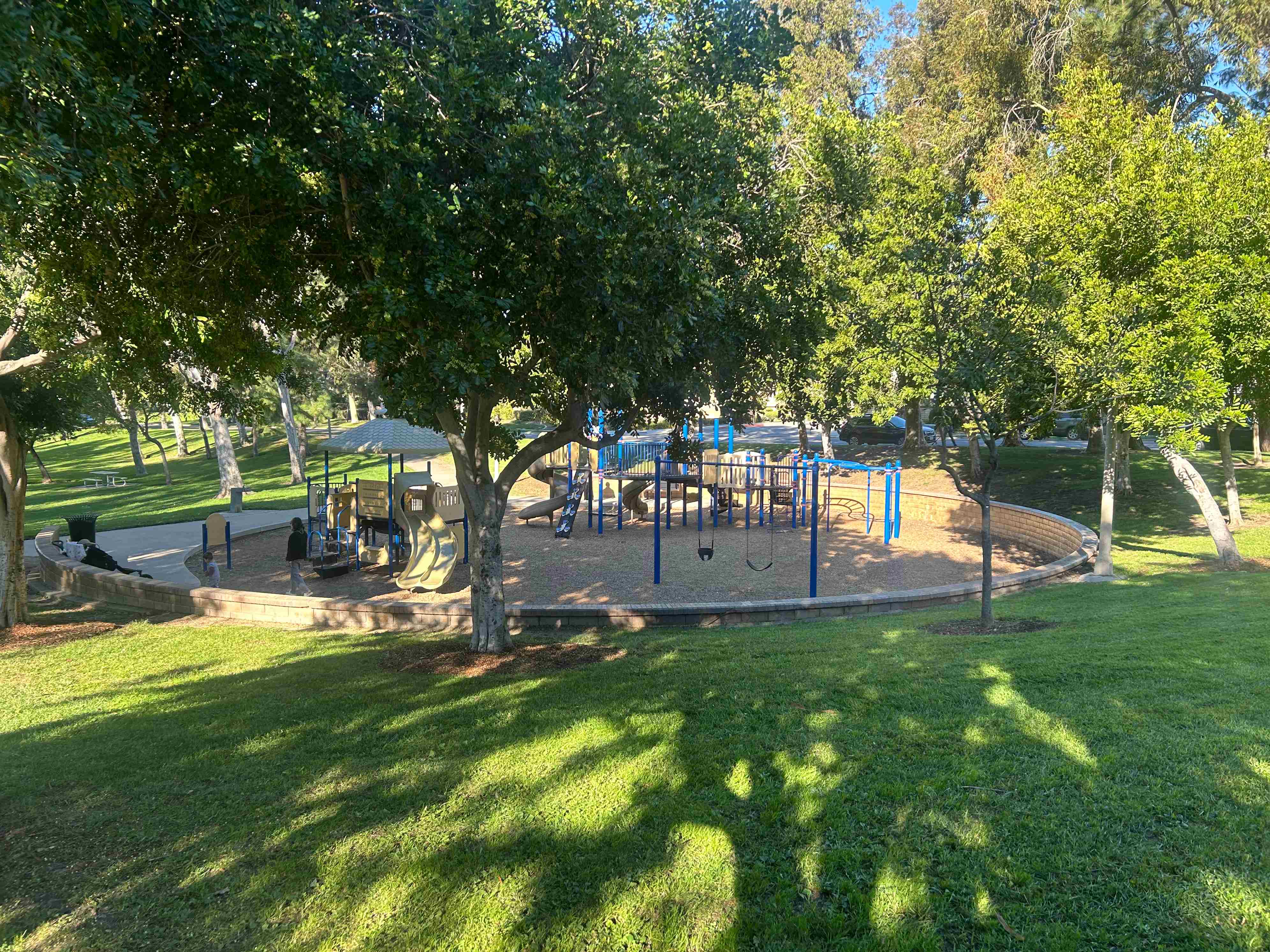 - Playgrounds/ Picnic Areas: There are two playground structures within the same sandbox. One for younger children (toddlers) and one for older kids, along with swings and slides. The park has plenty of uncovered picnic tables and barbecue grills available for public use scattered through the grass. A large picnic pavilion is also available for rent through the City of Orange (see photo).
